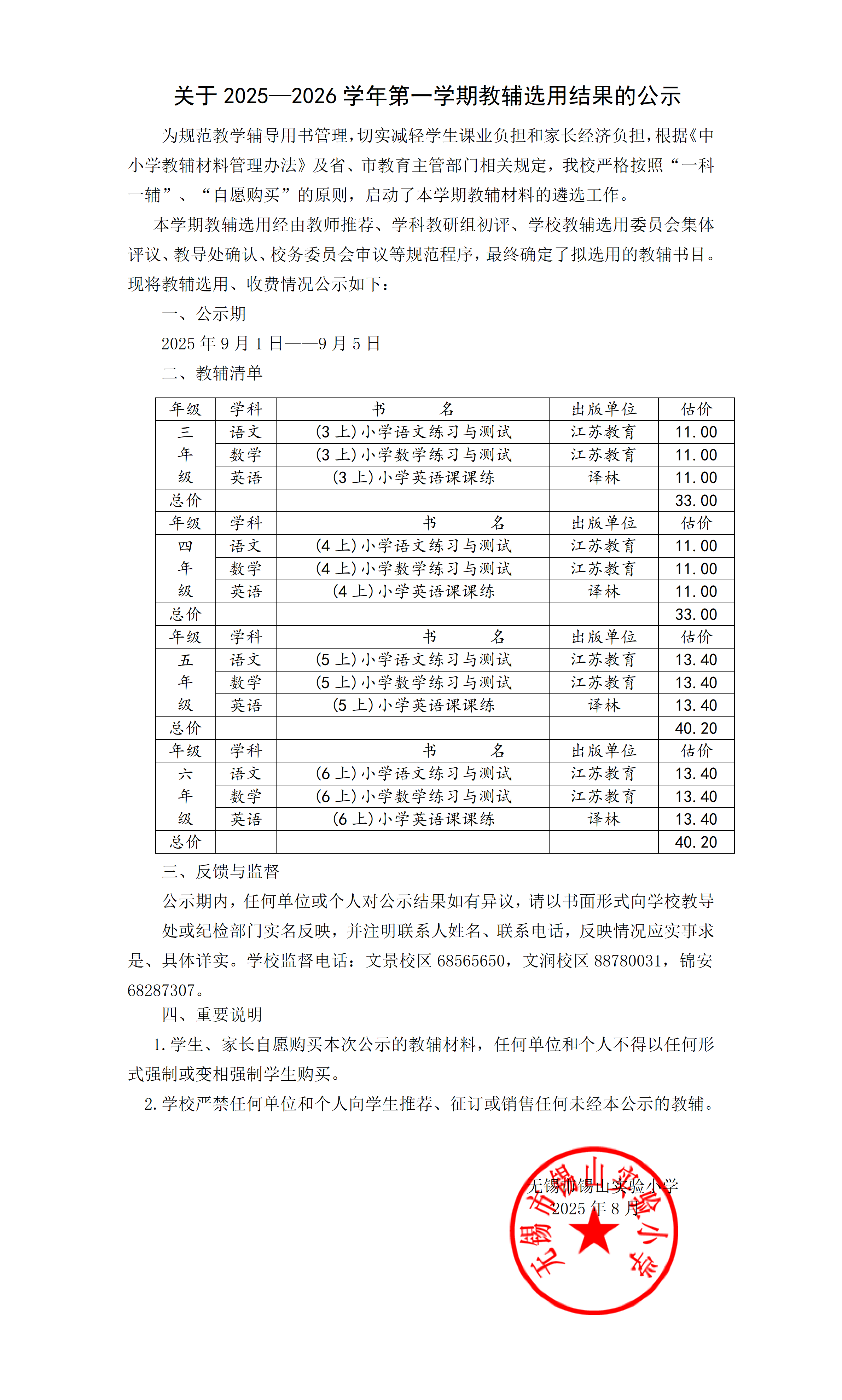关于2025—2026学年第一学期教辅选用结果的公示