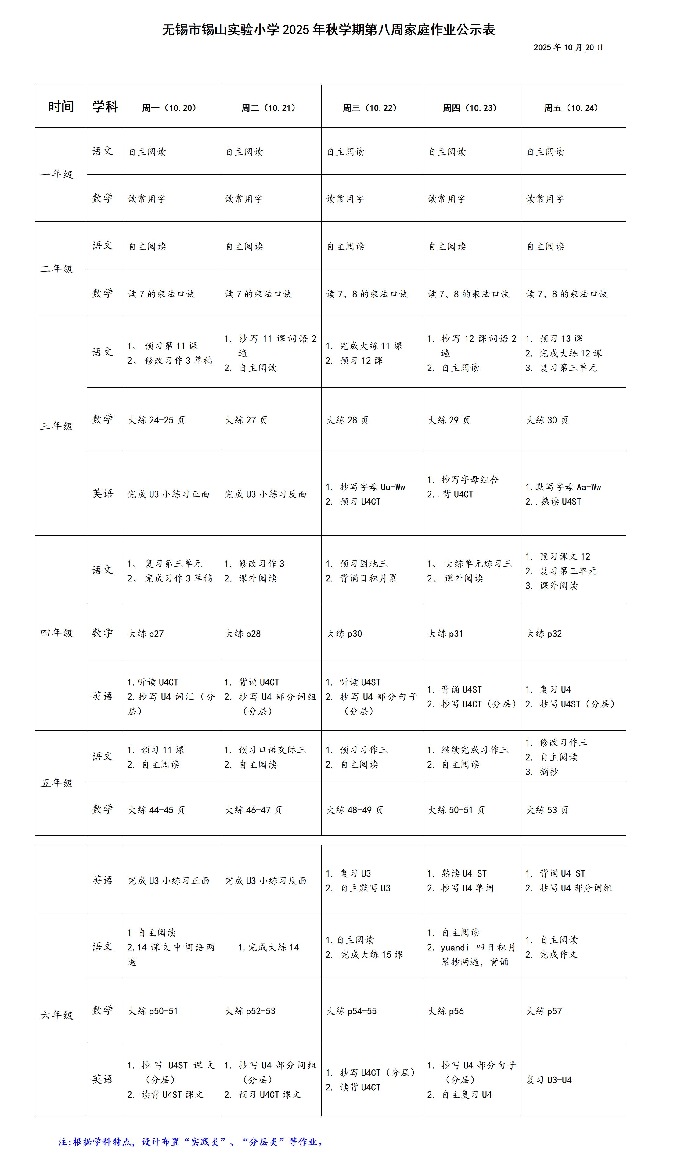 XSJY011-C0100-2025-030无锡市锡山实验小学2025年秋学期第八周家庭作业公示