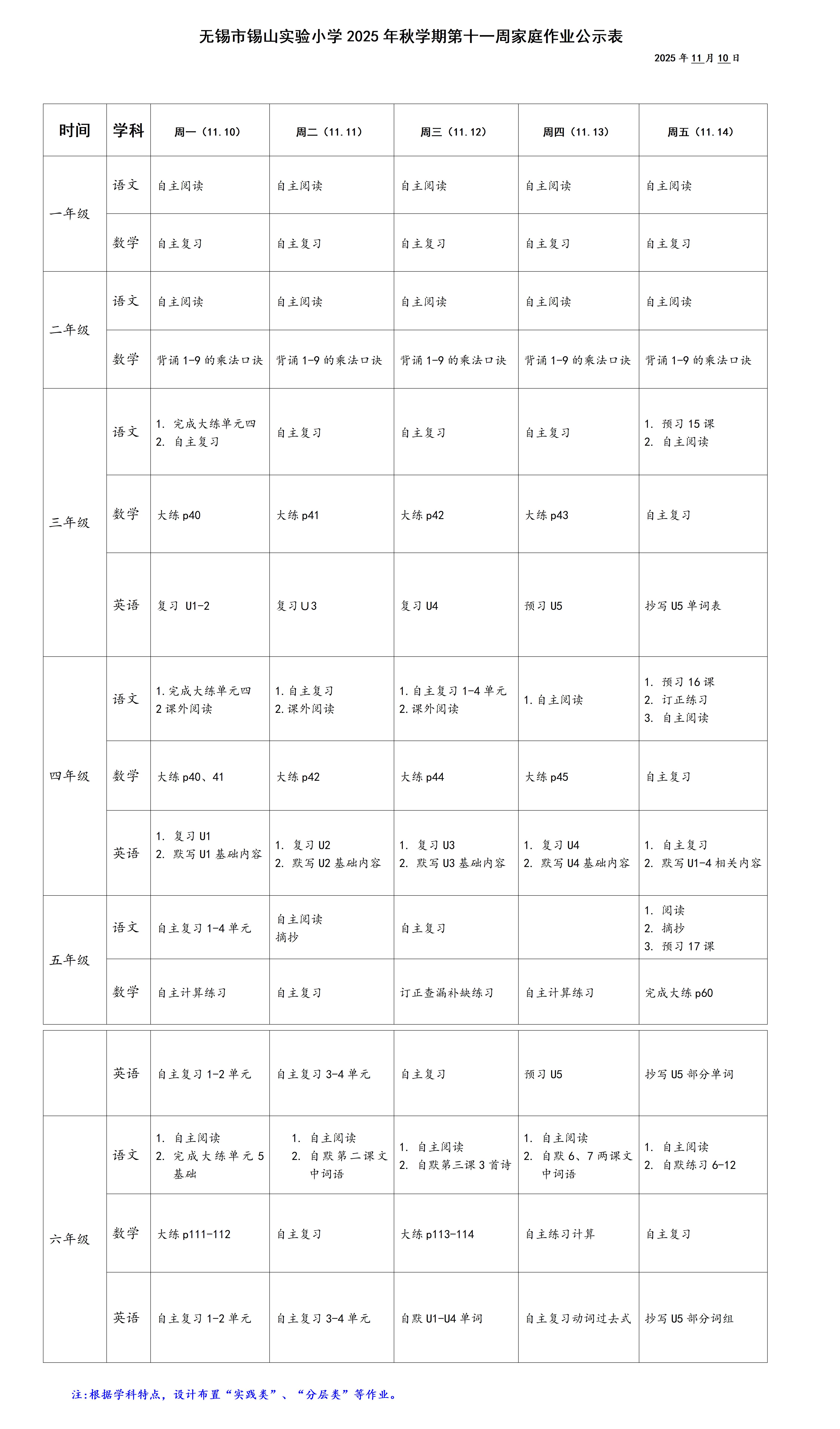 XSJY011-C0100-2025-033无锡市锡山实验小学2025年秋学期第十一周家庭作业公示