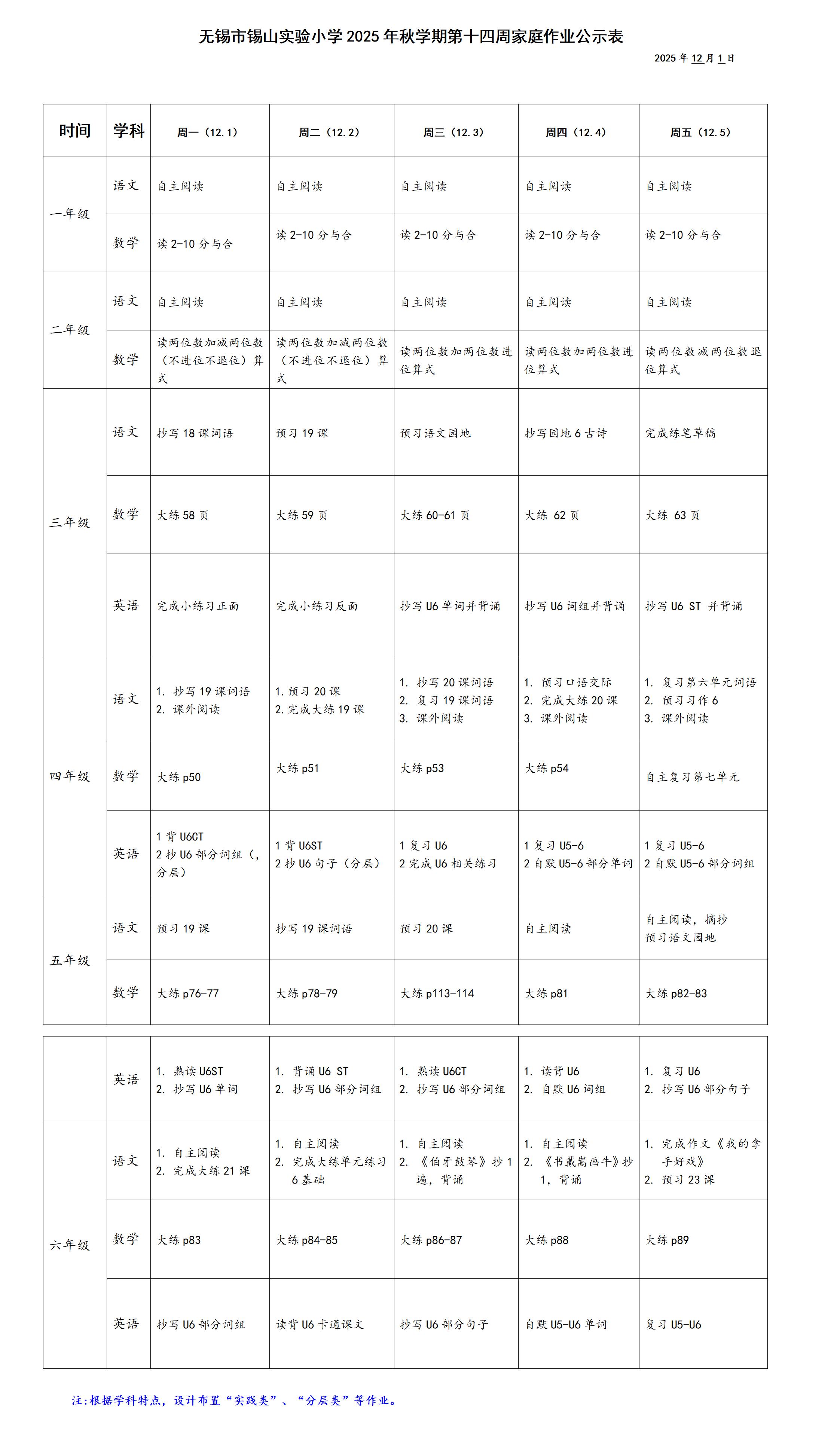 XSJY011-C0100-2025-036无锡市锡山实验小学2025年秋学期第十四周家庭作业公示