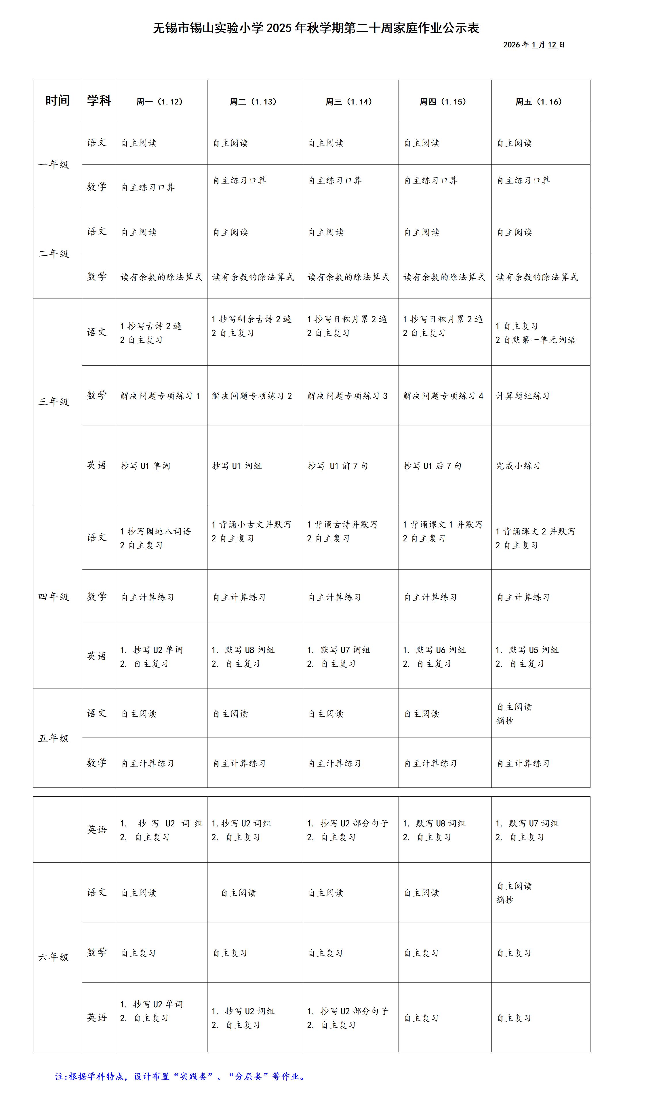 XSJY011-C0100-2025-042无锡市锡山实验小学2025年秋学期第二十周家庭作业公示